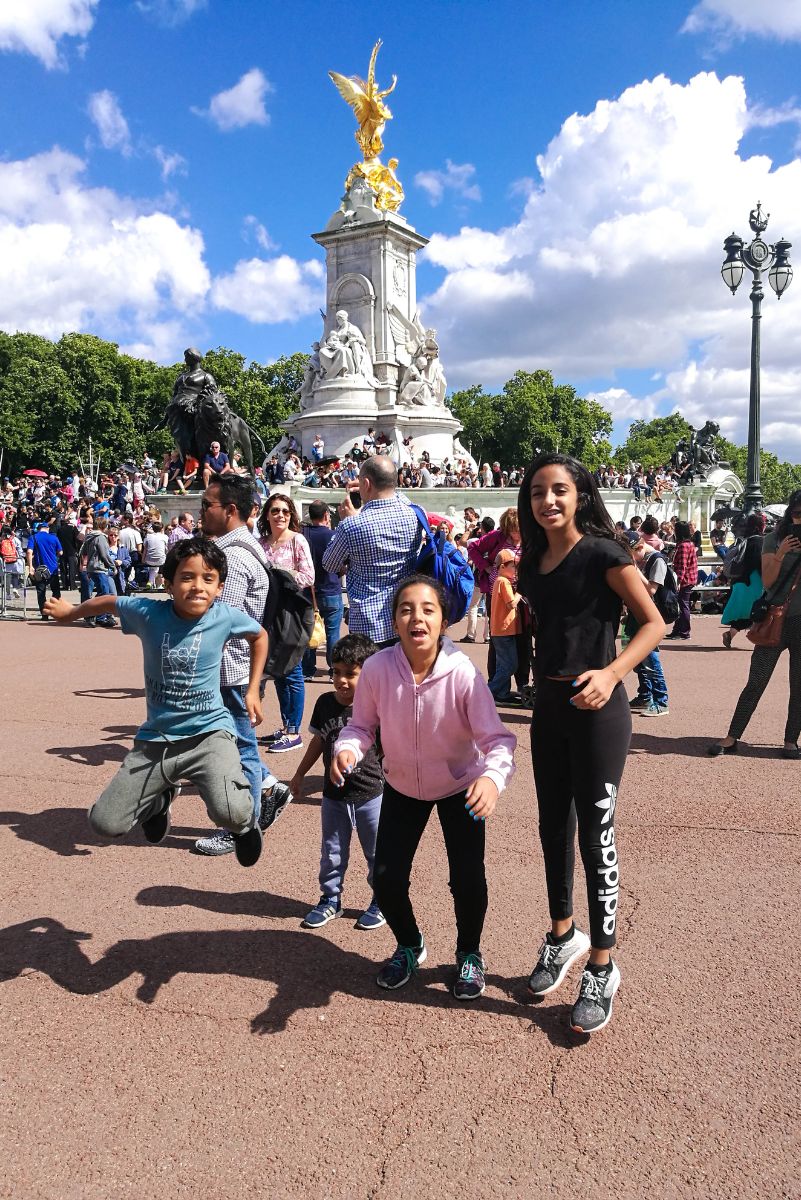 התחלנו מארמון בקינגהם Buckingham Palace, ארמון המלוכה הבריטי בלונדון, הארמון מרשים ומתוייר מאוד, לא נכנסנו לארמון, טיילנו ברחבה סביב הארמון, אך מאחר ובאותה התקופה היו אירועים ביטחוניים בלונדון, בוטלו כל טקסי החלפת משמר המלכה (המתחיל בדיוק ב11 בבוקר, ואורכו כ45 דקות) לכן לא יכולנו לצפות בטקס, אם אתם מגיעים ללונדון, אני חושבת שכדי לתכנן את המסלול שתהיו במקום בסביבות השעה 10:00 תתפסו מקום טוב, כדי לצפות בהכנות לטקס המתחילות ב10:15, החלפת המשמרות כוללת תהלוכה ברחוב ומלווה בתזמורת צבאית ולבסוף מבוצעת החלפת המשמרות ברחבת ארמון בקינגהאם, זה חלק מהחוויה הלונדונית ונחמד מאוד לילדים, אך למרות שפיספסנו, לפתע הופיעה במרכז הכביש בקרבת הארמון, תהלוכה של חיילי המשמר רכובים על סוסים, לבושים בתלבושות הרשמיות שלהם, מהר תפסתי את המצלמה, ביקשתי משירה לרוץ אחריהם והצלחנו לתפוס תמונה:-)
