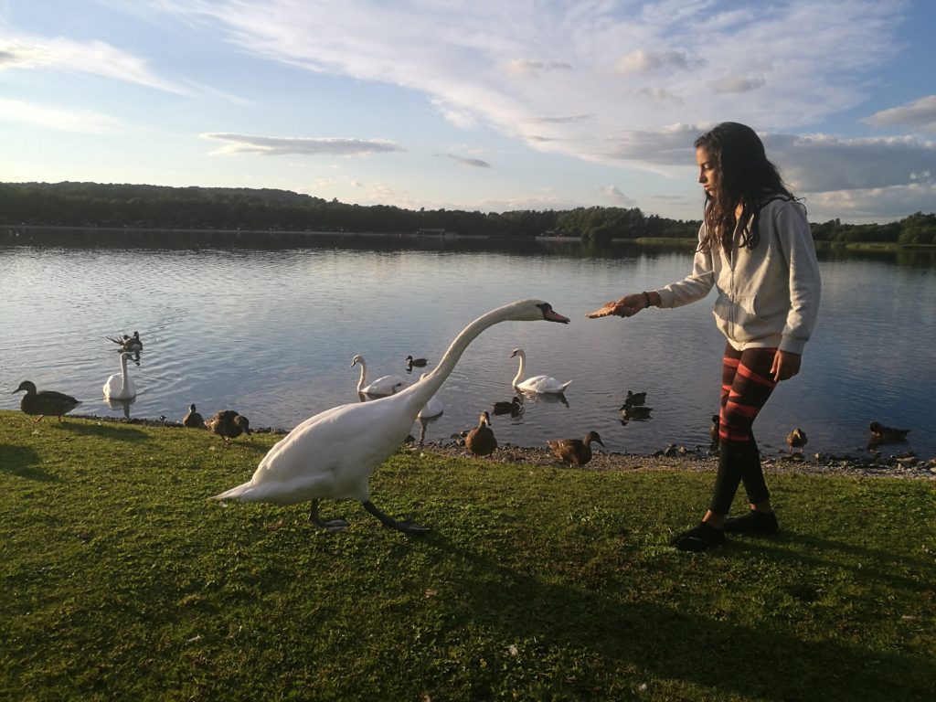 קמים לבוקר שמשי וכיפי, עם הקפה צועדים לעבר האגם המקסים מרחק כמה צעדים מהדירה, מתיישבים שם כמעט שעה וחצי עם כיכר לחם, הילדים מאכילים את הברווזים, הציפורים והברבורים, חוקרים את הסביבה, ואני כאוהבת טבע בכלל יוצאת מגדרי.. מבחינים בקן שהוקם באמצע האגם ויש בו גוזלים.. פתאום על עץ הפטל רואים זחלים וגלמים.. והנה ארנבת ופתאום עובר סנאי (הבאתי לסנאים אגוזי לוז מהארץ הבנתי שהם מפונקים….).